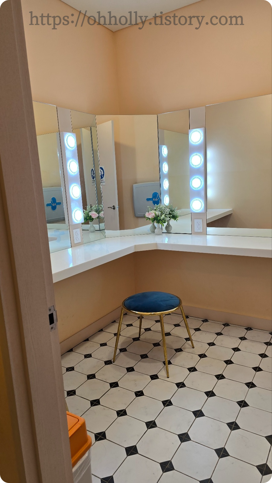 파우더룸처럼 보이는 곳에 기저귀갈이대
