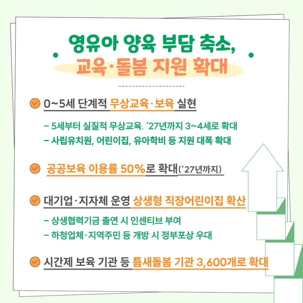 국·공립어린이집 등 공공보육 이용률 50%로 확대(’27년 까지)