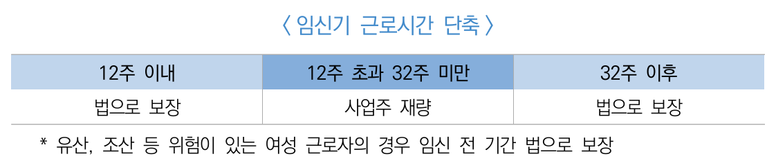 - 법적 청구권이 없는 임신 후 12주 초과 ~ 32주 미만의 여성 근로자는 사용자의 재량으로 근로시간을 단축할 수 있습니다.